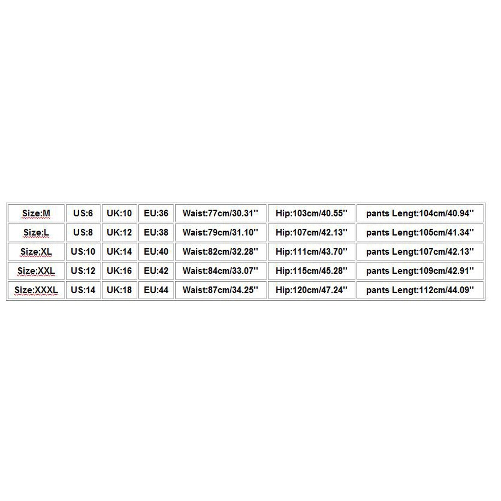| Size | US | UK | EU | Waist | Hip | pants Lengt |